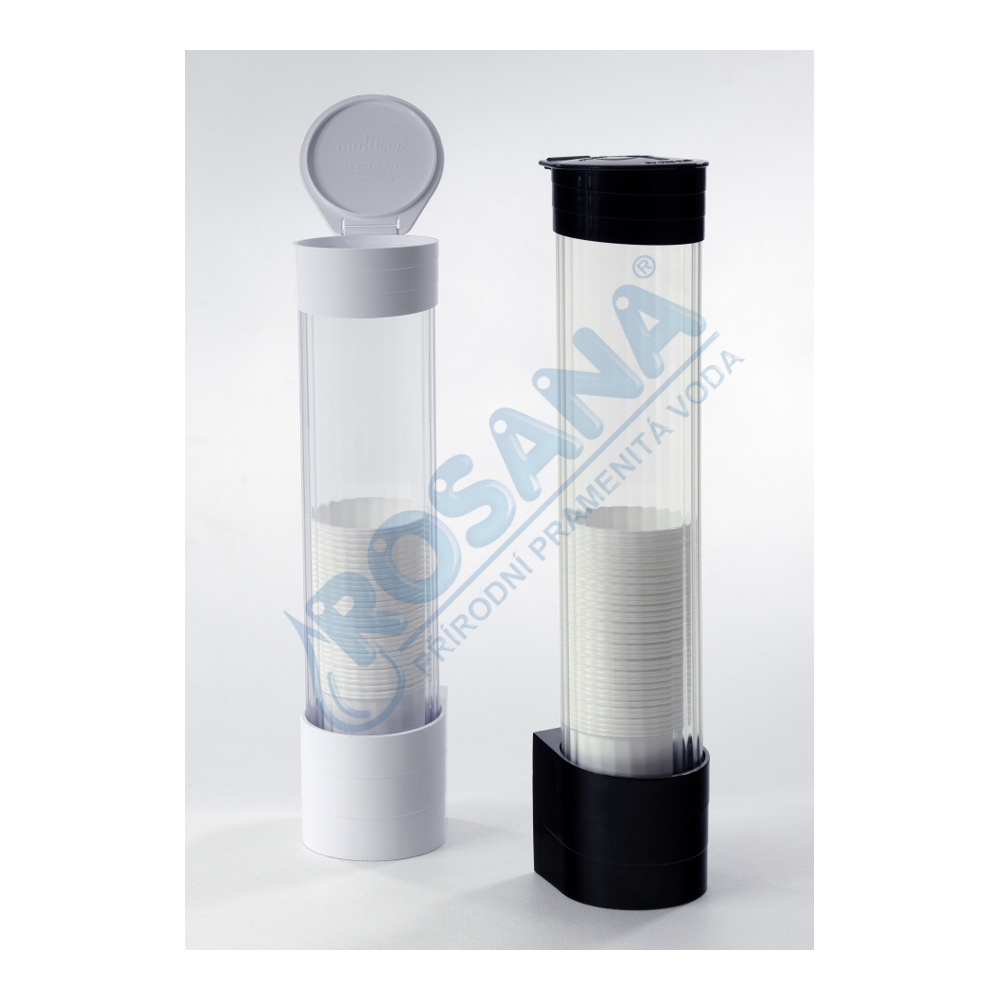 Zásobník na kelímky černý, který se připevňuje na výdejník z boku. Vrchní a spodní část tubusu na kelímky je z barevného plastu a tělo je z průhledného plastu.